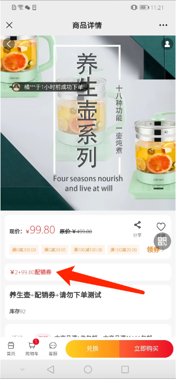 3、配销券使用限制:例如一个100的产品,配销券只有80,则无法兑换,如果配销券有110,则可以兑换,但是剩余10个券自动消失.
