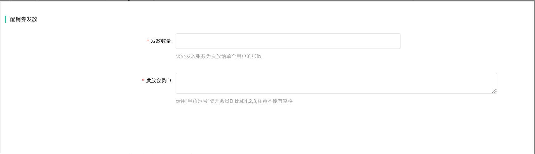 后台手动发放券,需输入发放的数量,注意,该处发放张数为发放给单个用户的张数,比如要给会员A和会员B各自获得5张,这里发放数量填写5。