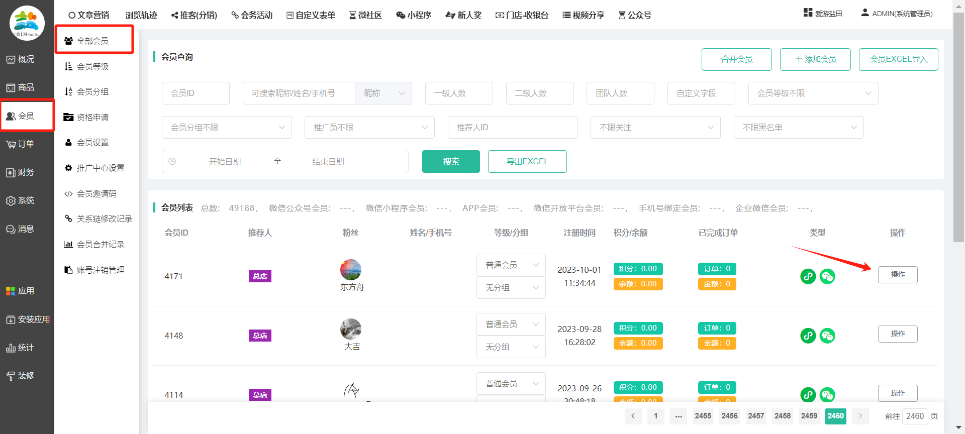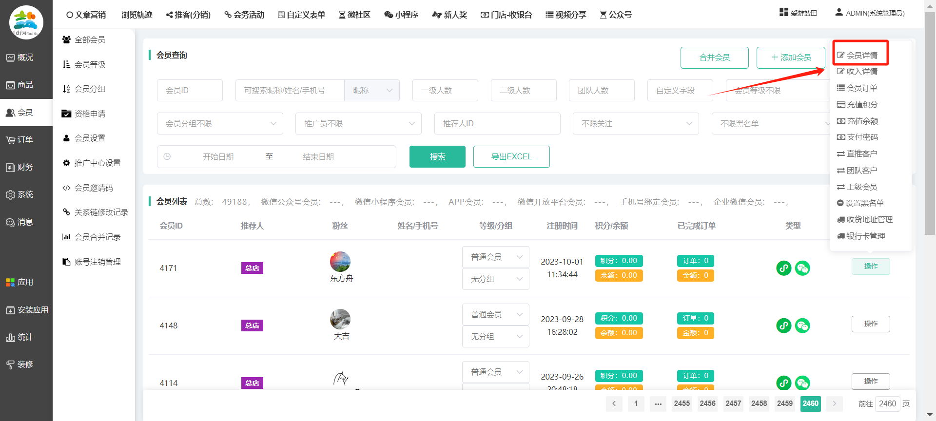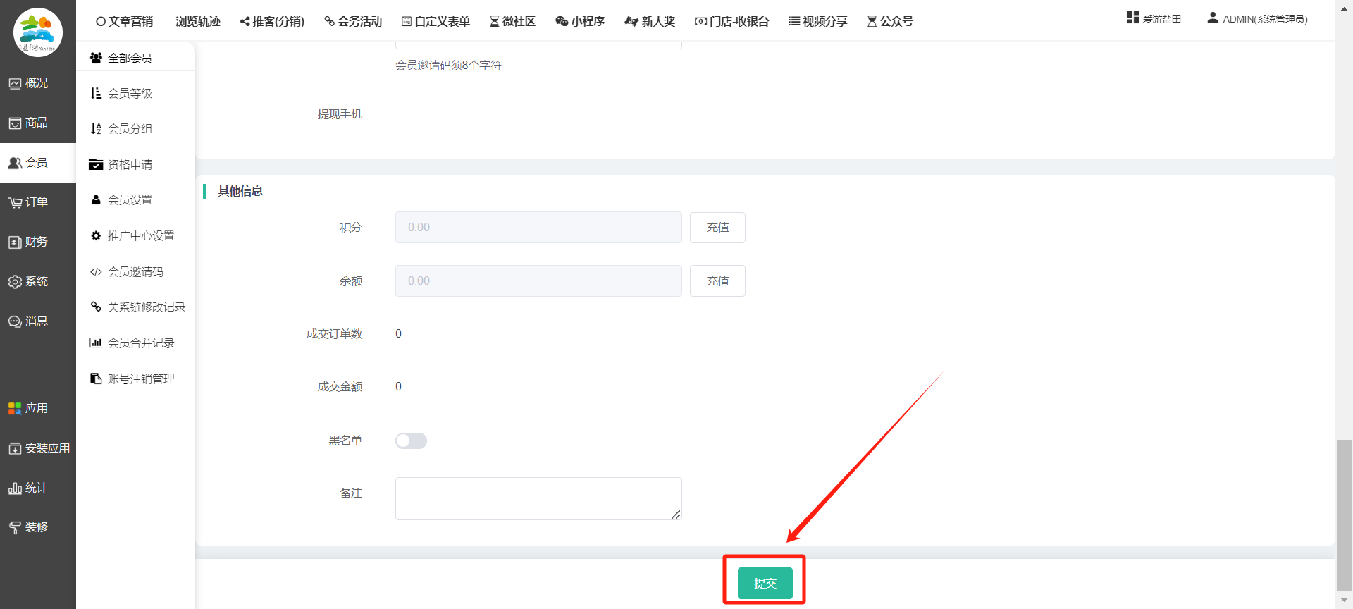 目录 搜索 展开 一、前期准备资料二、数字乡村码-上线操作指南1、服务号的申请流程及认证2、申请小程序流程3、开放平台绑定小程序和公众号三、数字乡村码-系统操作数字乡村码系统管理-概况数字乡村码-商品管理1、发布商品2、商品列表3、商品表单4、商品分类5、品牌管理6、配送模板7、评论管理8、优惠券管理9、商品标签10、退货地址设置11、满额优惠12、批量操作13、配送方式14、基础设置15、商品隐藏四、数字乡村码-会员管理1、全部会员2、会员等级3、会员分组4、资格申请5、会员设置6、推广中心设置7、会员邀请码8、会员关系链修改关系链修改记录9、会员合并记录10、账号注销管理11、会员设置中心五、数字乡村码-订单管理1、订单管理列表2、订单处理流程3、订单状态4、订单修改价格5、订单退款退货6、多包裹发货7、批量发货订单操作步骤8、催发货订单9、物流查询六、数字乡村码-财务管理1、余额设置2、会员余额3、充值记录4、转让记录5、余额明细6、收入明细7、提现设置8、提现统计9、积分管理10、转账审核11、收益广告12、批量充值七、数字乡村码-系统管理1、商城入口2、商城设置①、商城设置②、订单设置③、物流查询④、短信⑤、联系方式⑥、分类⑦、优惠券⑧、分享⑨、幻灯片⑩、广告位⑫、地图设置3、交易设置4、微信模板消息自定义消息模板(新版)自定义消息模板(旧版)小程序消息模板公众号模板消息变更公告5、语言设置6、权限管理7、多媒体管理八、数字乡村码-消息管理九、数字乡村码-应用管理十、数字乡村码系统-数据统计十一、数字乡村码-页面装修DIY1、模板管理2、店铺页面3、顶部导航4、底部导航5、DIY模板市场6、首屏广告7、基础设置8、装修DIY尺寸建议十二、供应商功能插件操作指南1、供应商2、门店-收银台门店申请和使用步骤门店管理①、门店-收银台 营销设置②、门店-收银台 分润设置门店分类门店申请门店审核门店商品门店商品订单收银台订单数据统计核销员基础设置默认设置门店装修3、微社区4、会务活动十三、营销插件操作指南活动报名提货卡新人奖微店问卷调查积分视频分享1、视频分享基础设置2、视频分享发现管理3、视频分享分类管理4、视频分享评论管理5、视频分享分红记录6、视频分享短视频中心每日红包幸运大抽奖签到优惠券二维码任务奖励优惠劵文章音频文章付费文章限时购新海报拓客卡操作流程积分活动素材中心视频红包十四、入驻门店应用类1、门店预约2、附近商品3、门店定位设置4、门店控制5、门店满额包邮6、门店满额减7、导入商品8、门店搜索9、门店股东10、核销券11、多门店核销1、商城后台设置2、前端功能演示十五、常见问题1、后台登录密码修改流程2、会员-余额,积分,后台如何进行充值与扣除3、如何修改上下级关系4、一种万能的获取商城小程序路径的方法 暂无相关搜索结果! 阅读次数:1573 本文档使用 模王系统 发布 8、会员关系链修改 8、会员关系链修改一.如何修改上下级关系?1.会员-全部会员-可以通过搜索用户的独立ID,或者用户微信昵称,找到此会员,然后点击右边的(操作)2.再点击会员详情。3.滑到下面,有个推广信息-会员上线,点击修改4.输入上级的ID号,点击搜索,出来此上级会员后点击选择。5.滑到最下面,一定要点击提交按钮。文档更新时间: 2023-11-30 14:56 作者:链上旅行