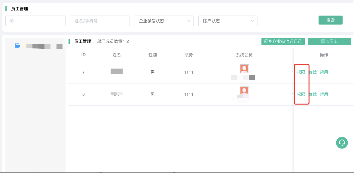 权限:默认为部门设置的权限,如果开启并设置独立权限,则员工登录企业管理PC端可以管理部门和员工。